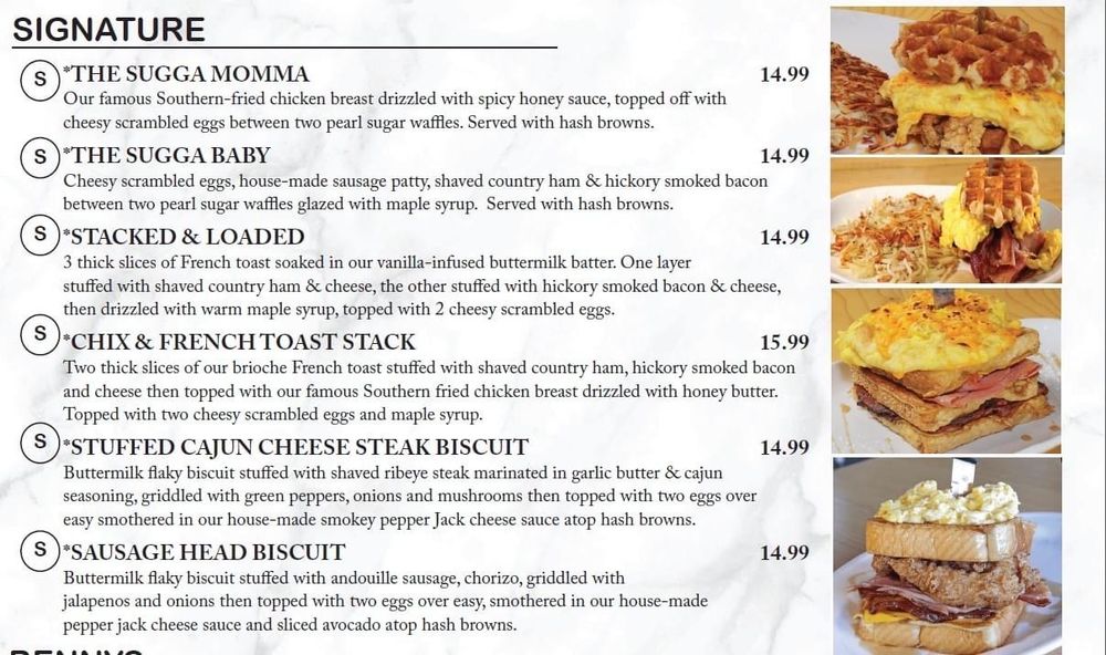 Buttermilk biscuit stuffed with our crispy southern fried chicken breast topped with cheesy scrambled eggs and smothered in country gravy atop hash browns.